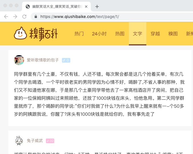 接下来我们就来爬取一下之前我们爬取过的糗百的内容。