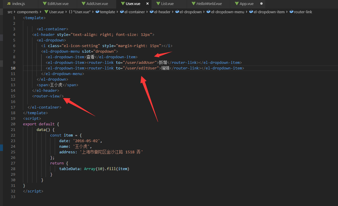 总结:由于移动端兴起,带动了单页应用,单页一个页面互相跳转怎么搞呢,vue - Router 专门来做这个事情的,说白了就是 默认就是 锚点 实现,我这里结合elementui 简单做了一下效果。