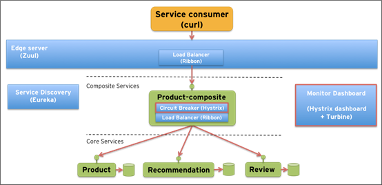 将前一部分Part 1实现的微服务系统,进一步添加支持性的基础服务-Hystrix Dashboard和Turbine。另外,微服务product-composite也增强了基于Hystrix的电路断路器。新增的2个组件标识为红色外框,如下图所示:
