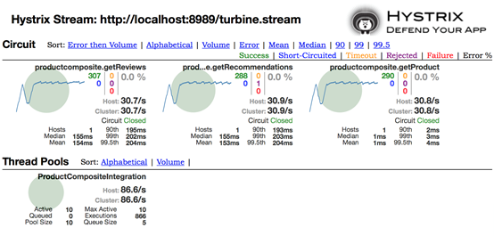 然而,Hystrix不时地让一部分请求通过电路,查看是否可以调用成功,也就是检查review服务是否再次恢复正常。我们可以多次重复执行curl调用,查看product-composite服务的输出日志: