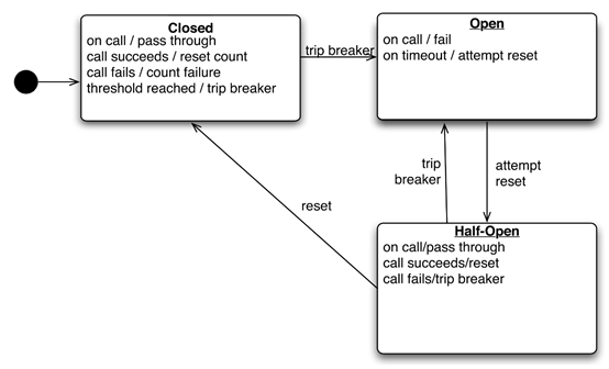 通常,我们将这一类问题称为失败链(a chain of failures),一个组件中的错误将导致依赖于错误组件中的其他组件也产生错误。在基于微服务的系统中,尤其是大量独立部署的微服务相互通信,这一情况需要特别关注。针对这一问题的通用解决方案是应用电路断路器模式(circuit breaker pattern),详细信息可以查阅其他文档,或者阅读Fowler-Circuit Breaker的文章。一个典型电路断路器应用如下状态转换图: