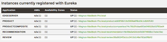 和Part 1 一样,我们可以在服务发现Web应用中看到如下4个业务服务和一个edge-server,如下所示(http://localhost:8761):