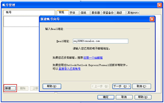2、点击"新建",在弹出的对话框中填写邮箱地址,然后点击"下一步"。