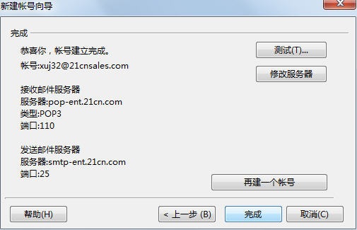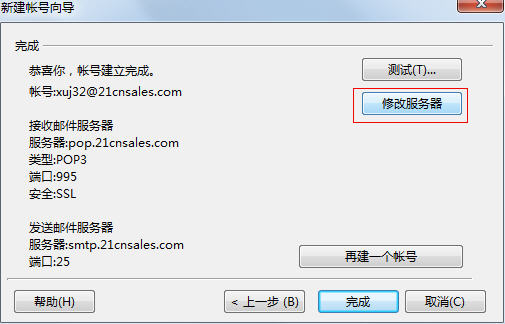 4、在帐号建立完成页面,点击: "修改服务器"。