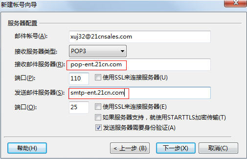 5、选择POP3或IMAP服务后,填写POP3/IMAP、SMTP服务器地址以及完整的邮箱帐号(例如:test@abc.com)。然后点击:下一步。