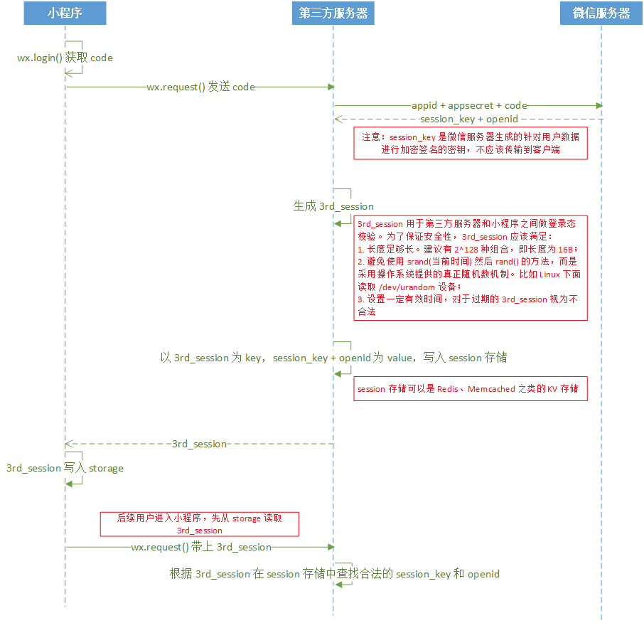 第三方服务器端拿到请求回来的session_key和openid,先留着,不能给客户端;然后用操作系统提供的真正随机数算法生成一个新的session,叫3rd_session