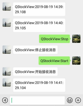 (5)如上图所示,为了避免报警消息打扰到用户,当用户不想接收报警消息时,登录发送报警的用户或者接受报警消息的用户,都可以在手机微信上通过反向控制命令:QStockView:Stop(或者QStockView:停止)停止接收报警消息,也可以通过反向控制命令QStockView:Start(或者QStockView:开始)来开始接收报警消息;QStockView是软件名称,也是软件公众号。冒号后面就是命令。不区分大小写,中间不能有空格,否则命令无效。发送命令成功之后,会返回一个通知消息。表示命令发送成功。