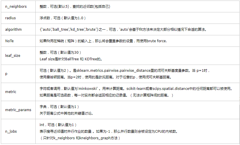 print(__doc__) from sklearn.neighbors import NearestNeighbors import numpy as np X = np.array([[-1, -1], [-2, -1], [-3, -2], [1, 1], [2, 1], [3, 2]]) nbrs = NearestNeighbors(n_neighbors=2, algorithm='ball_tree').fit(X) distances, indices = nbrs.kneighbors(X) #indeices邻节点,distances邻节点距离 print('邻节点距离\n',distances) print('邻节点\n', indices) print(nbrs.kneighbors_graph(X).toarray())