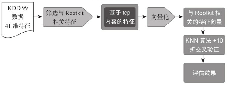 基于KDD 99的样本数据,尝试使用KNN算法识别基于telnet连接的Rootkit行为,检测流程如下所示。