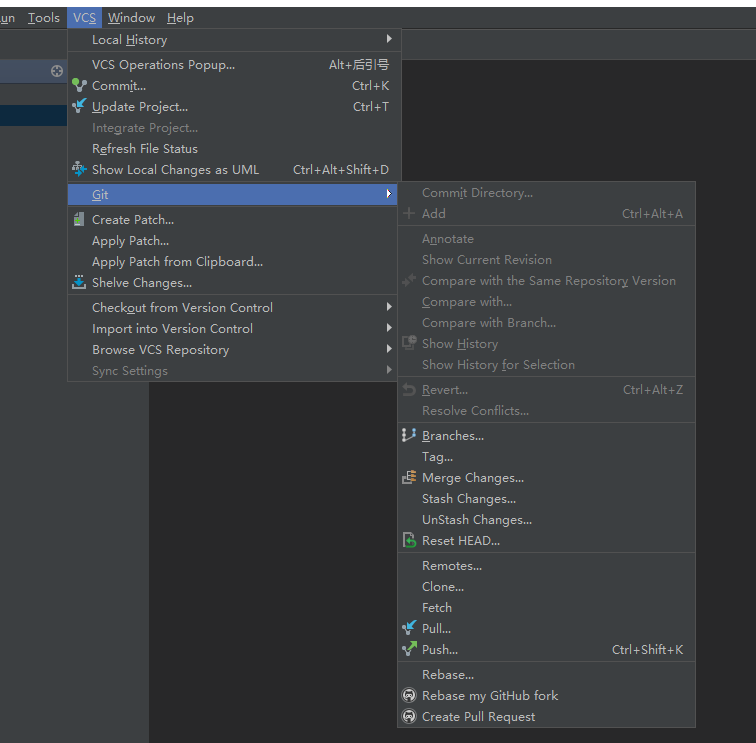 1.以上只是commit和clone的操作,具体的push,add,status等git常用操作都在VCS菜单里的GIT可以找得到