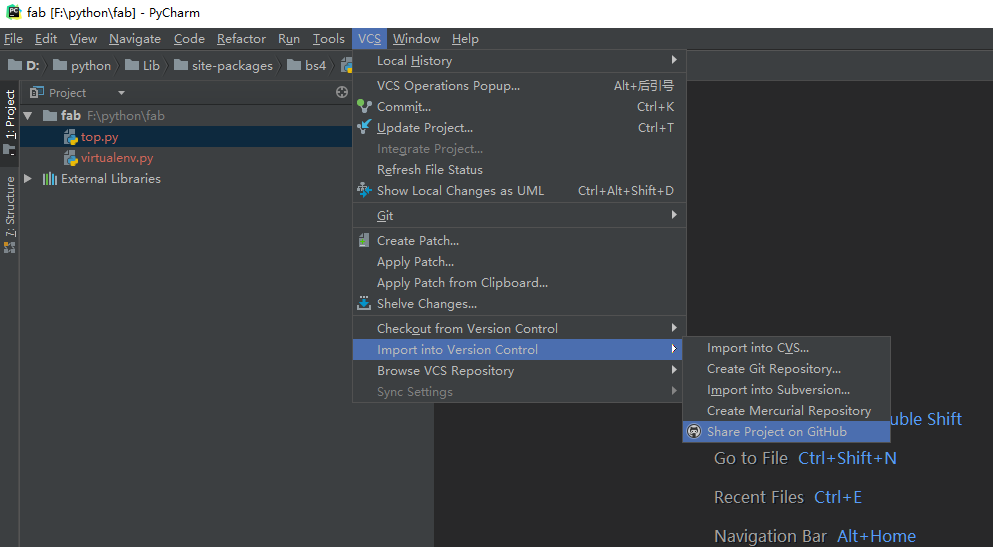 1.点击pycharm顶部的VCS选项-->Import into Version Control -->Share Project on GitHub(共享项目)