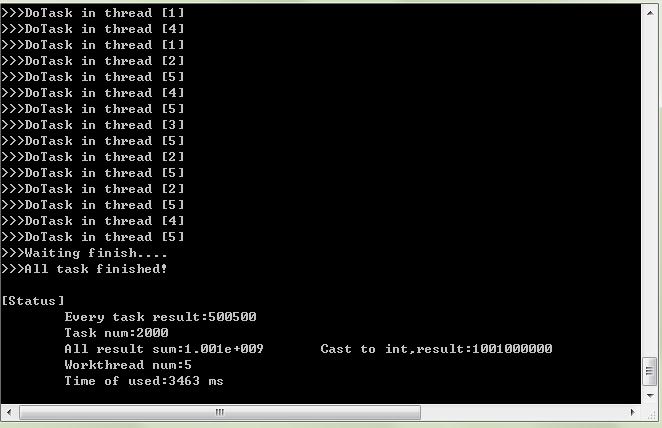 1 //-------------------------------------------------------------- 2 开发工具:Visual Studio 2012 3 //--------------------------------------------------------------- 4 //C++ 5 #include <iostream> 6 #include <memory> 7 #include <thread> 8 #include <mutex> 9 #include <condition_variable> 10 #include <queue> 11 #include <vector> 12 13 using namespace std; 14 15 //windows 16 #include <windows.h> 17 18 19 /************************************************ 20 [示例]实现一个多线程方式下的协同工作程序 21 22 当一个线程(相对的主线程)在完成一个任务的时 23 候,有时候为了提高效率,可以充分利用多核CPU的 24 优势可以将手中的任务分成多个部分,分发给比较 25 空闲的辅助线程来帮助处理,并且主线程要等待所 26 有的辅助线程都处理完成后,对所有任务进行一次 27 汇总,才能进行下一步操作,此时就需要一个同步的 28 多线程协同工作类。 29 *************************************************/ 30 31 32 //定义一个求累积和的任务类 33 class CSumTask 34 { 35 public: 36 CSumTask(double dStart,double dEnd); 37 ~CSumTask(); 38 double DoTask(); 39 double GetResult(); 40 private: 41 double m_dMin; 42 double m_dMax; 43 double m_dResult; 44 }; 45 46 CSumTask::CSumTask(double dStart,double dEnd):m_dMin(dStart),m_dMax(dEnd),m_dResult(0.0) 47 { 48 49 } 50 CSumTask::~CSumTask() 51 { 52 53 } 54 double CSumTask::DoTask() 55 { 56 57 for(double dNum = m_dMin;dNum <= m_dMax;++dNum) 58 { 59 m_dResult += dNum; 60 } 61 return m_dResult; 62 } 63 64 double CSumTask::GetResult() 65 { 66 return m_dResult; 67 } 68 69 70 //定义一个任务管理者 71 class CTaskManager 72 { 73 public: 74 CTaskManager(); 75 ~CTaskManager(); 76 size_t Size(); 77 void AddTask(const std::shared_ptr<CSumTask> TaskPtr); 78 std::shared_ptr<CSumTask> PopTask(); 79 protected: 80 std::queue<std::shared_ptr<CSumTask>> m_queTask; 81 }; 82 83 CTaskManager::CTaskManager() 84 { 85 86 } 87 88 CTaskManager::~CTaskManager() 89 { 90 91 } 92 93 size_t CTaskManager::Size() 94 { 95 return m_queTask.size(); 96 } 97 98 void CTaskManager::AddTask(const std::shared_ptr<CSumTask> TaskPtr) 99 { 100 m_queTask.push(std::move(TaskPtr)); 101 } 102 103 std::shared_ptr<CSumTask> CTaskManager::PopTask() 104 { 105 std::shared_ptr<CSumTask> tmPtr = m_queTask.front(); 106 m_queTask.pop(); 107 return tmPtr; 108 } 109 110 111 //协同工作线程管理类,负责创建协同工作线程并接受来自主线程委托的任务进行处理 112 class CWorkThreadManager 113 { 114 public: 115 CWorkThreadManager(unsigned int uiThreadSum ); 116 ~CWorkThreadManager(); 117 bool AcceptTask(std::shared_ptr<CSumTask> TaskPtr); 118 bool StopAll(bool bStop); 119 unsigned int ThreadNum(); 120 protected: 121 std::queue<std::shared_ptr<CSumTask>> m_queTask; 122 std::mutex m_muTask; 123 int m_iWorkingThread; 124 int m_iWorkThreadSum; 125 std::vector<std::shared_ptr<std::thread>> m_vecWorkers; 126 127 void WorkThread(int iWorkerID); 128 bool m_bStop; 129 std::condition_variable_any m_condPop; 130 std::condition_variable_any m_stopVar; 131 }; 132 133 CWorkThreadManager::~CWorkThreadManager() 134 { 135 136 } 137 unsigned int CWorkThreadManager::ThreadNum() 138 { 139 return m_iWorkThreadSum; 140 } 141 142 CWorkThreadManager::CWorkThreadManager(unsigned int uiThreadSum ):m_bStop(false),m_iWorkingThread(0),m_iWorkThreadSum(uiThreadSum) 143 { 144 //创建工作线程 145 for(int i = 0; i < m_iWorkThreadSum;++i) 146 { 147 std::shared_ptr<std::thread> WorkPtr(new std::thread(&CWorkThreadManager::WorkThread,this,i+1)); 148 m_vecWorkers.push_back(WorkPtr); 149 } 150 151 } 152 153 bool CWorkThreadManager::AcceptTask(std::shared_ptr<CSumTask> TaskPtr) 154 { 155 std::unique_lock<std::mutex> muLock(m_muTask); 156 if(m_iWorkingThread >= m_iWorkThreadSum) 157 { 158 return false; //当前已没有多余的空闲的线程处理任务 159 } 160 m_queTask.push(TaskPtr); 161 m_condPop.notify_all(); 162 return true; 163 } 164 165 void CWorkThreadManager::WorkThread(int iWorkerID) 166 { 167 while(!m_bStop) 168 { 169 std::shared_ptr<CSumTask> TaskPtr; 170 bool bDoTask = false; 171 { 172 std::unique_lock<std::mutex> muLock(m_muTask); 173 while(m_queTask.empty() && !m_bStop) 174 { 175 m_condPop.wait(m_muTask); 176 } 177 if(!m_queTask.empty()) 178 { 179 TaskPtr = m_queTask.front(); 180 m_queTask.pop(); 181 m_iWorkingThread++; 182 bDoTask = true; 183 } 184 185 } 186 //处理任务 187 if(bDoTask) 188 { 189 TaskPtr->DoTask(); 190 { 191 std::unique_lock<std::mutex> muLock(m_muTask); 192 m_iWorkingThread--; 193 cout<<">>>DoTask in thread ["<<iWorkerID<<"]\n"; 194 } 195 } 196 m_stopVar.notify_all(); 197 } 198 } 199 200 bool CWorkThreadManager::StopAll(bool bStop) 201 { 202 { 203 std::unique_lock<std::mutex> muLock(m_muTask); 204 while(m_queTask.size()>0 || m_iWorkingThread>0) 205 { 206 m_stopVar.wait(m_muTask); 207 cout<<">>>Waiting finish....\n"; 208 } 209 cout<<">>>All task finished!\n"; 210 211 } 212 213 m_bStop = true; 214 m_condPop.notify_all(); 215 //等待所有线程关闭 216 for(std::vector<std::shared_ptr<std::thread>>::iterator itTask = m_vecWorkers.begin();itTask != m_vecWorkers.end();++itTask) 217 { 218 (*itTask)->join(); 219 } 220 return true; 221 } 222 223 224 /************************************** 225 [示例程序说明] 226 227 每个任务对象表示求1+2+....+1000的累 228 积和,现在有2000个这样的任务,需要将每个 229 任务进行计算,然后将所有的结果汇总求和。 230 利用多线程协同工作类对象辅助完成每 231 个任务结果计算,主线程等待所有结果完成 232 后将所有结果汇总求和。 233 ****************************************/ 234 235 236 int main(int arg,char *arv[]) 237 { 238 239 std::cout.sync_with_stdio(true); 240 CTaskManager TaskMgr; 241 CWorkThreadManager WorkerMgr(5); 242 std::vector<std::shared_ptr<CSumTask>> vecResultTask; 243 244 for(int i = 0; i < 2000; ++i) 245 { 246 std::shared_ptr<CSumTask> TaskPtr(new CSumT