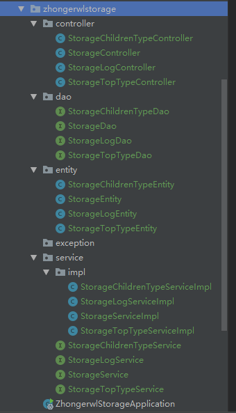 三、在启动类的包下新建controller,service,serviceImpl,dao,entity包并建好对应4个表的四组类