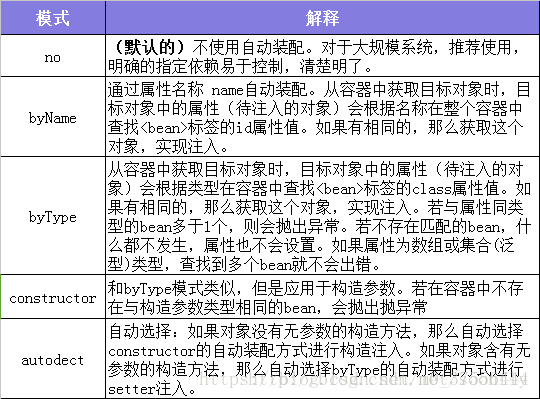 bytype 根据类型自动装配 不用管bean的id 同一种类型的bean只能有一个 --> <bean id="service" class="cn.ioc.service.imp.UserServiceImp" autowire="byName"> </bean> </beans>