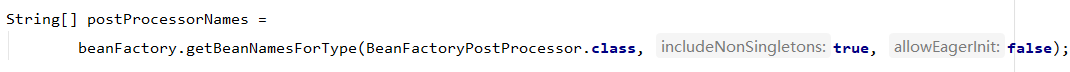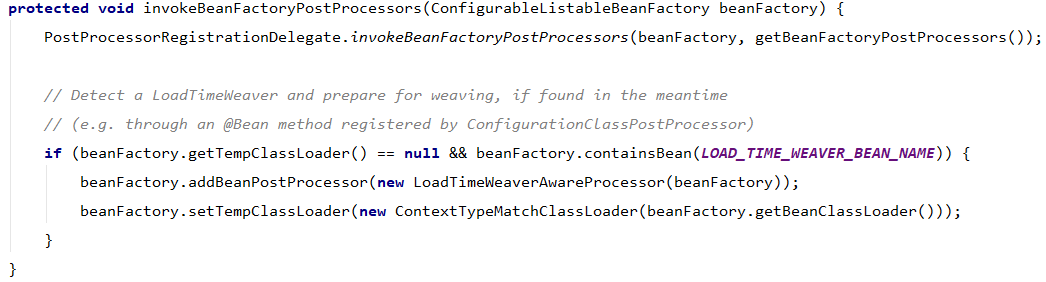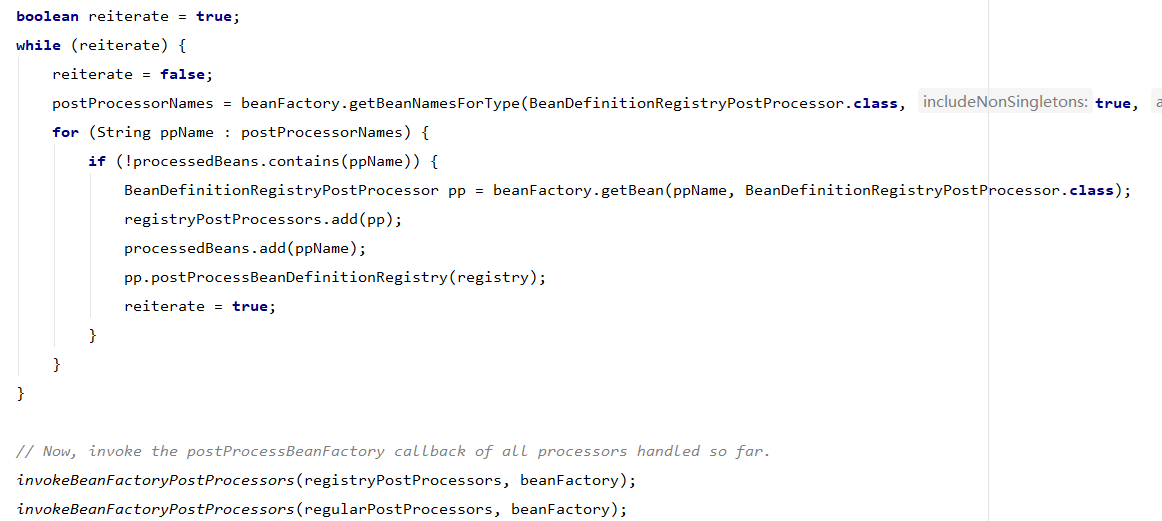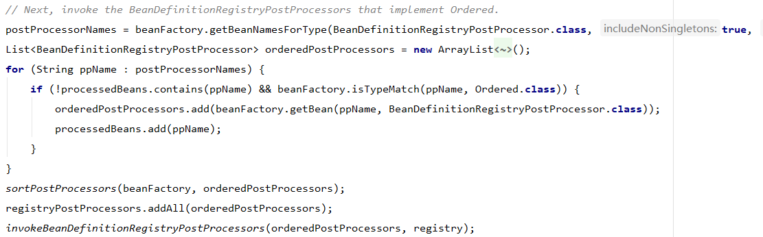 invokeBeanFactoryPostProcessors(beanFactory);//调用BeanFactoryPostProcessor,先调用BeanDefinitionRegistryPostProcessor,按PriorityOrdered->Ordered->None顺序调用,而后调用BeanFactoryPostProcessor,顺序与前面相同