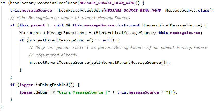 a)若BeanDefinitions中包含MessageSource,则将其注入到ApplicationContext中