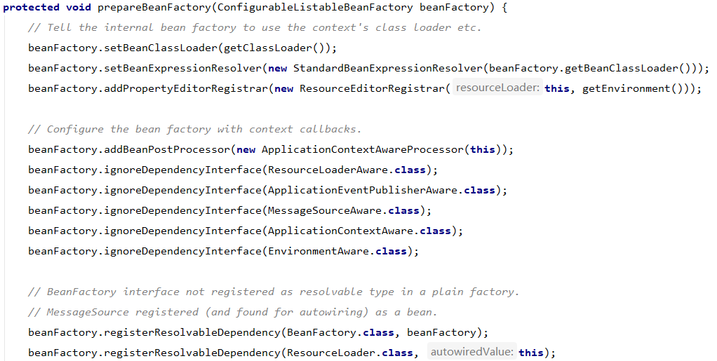 3.prepareBeanFactory方法,向BeanFactory中添加初始化必须的属性及Bean,如自动装配处理器、资源自动注入处理器、各种默认回调接口处理