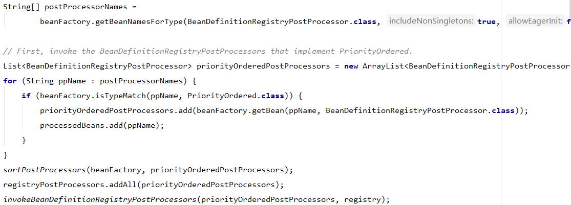 b)从BeanDefinitions中获取BeanDefinitionRegistryPostProcessor类型,如果实现PriorityOrdered接口表明属于优先级排序的PostProcessor,排序后加入到registryPostProcessors中,优先调用