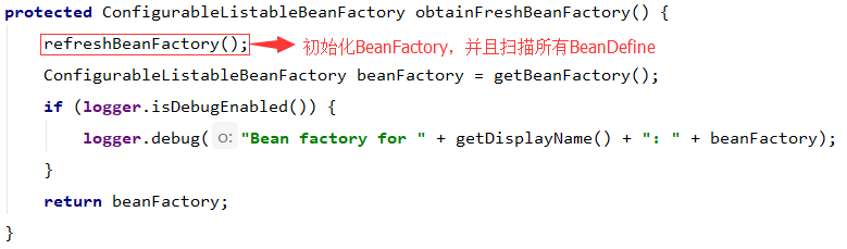 ConfigurableListableBeanFactory beanFactory = obtainFreshBeanFactory(); //初始化BeanFactory并扫描BeanDefinitions