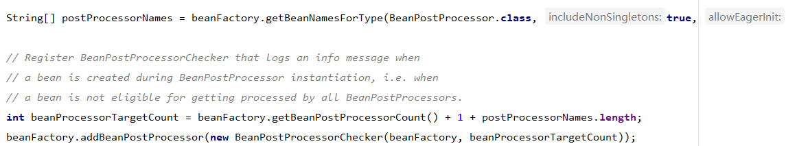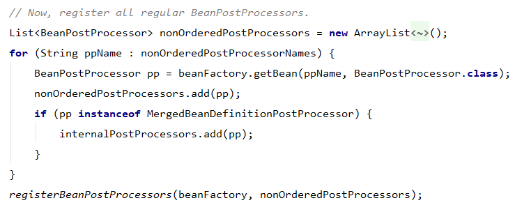 a)扫描BeanDefinition中所有BeanPostProcessor接口实现类,先添加BeanPostProcessorChecker,用于打印日志