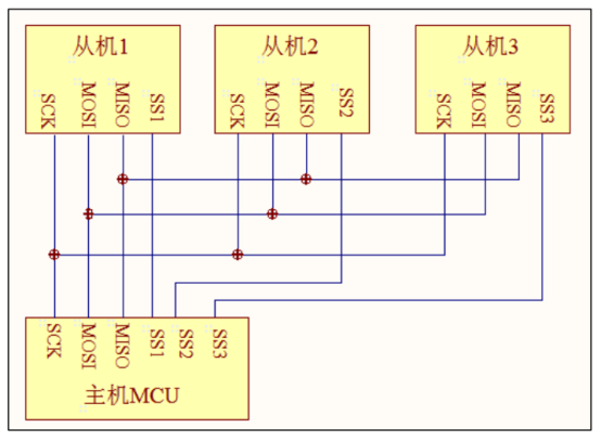 由SPI设备连接图可以看到,除了片选信号,主机和多个从机的SCK线、MOSI线和MISO线是共用的。