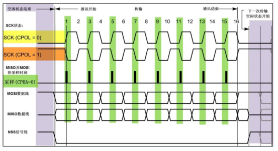 从机在SCK为低电平的时候输出MISO电平,然后在SCK从低电平变为高电平的时候保持MISO的电平状态并且同时读取MOSI数据线上的电平。