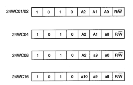 由于24C02只有256个字节的存储空间,所以只需要1个字节就可以寻址完24C02的存储空间,但是无法寻址完更大容量的存储IC,比如24C04的存储容量是512字节,需要9个bit的地址位才能寻址完。由上图可以看到,24C04的设备地址内是没有A0参数的,被a8代替了,这个a8就是24C04的第9个bit的地址位,也就是说24C04的A0引脚是不起作用的,这样也就造成了在I2C总线上只能同时挂载4个24C04芯片。其它存储器如24C08、24C16也可以这么类推。