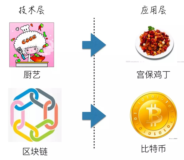 “区块链仅仅是一门技术而已”,“比特币”仅仅是区块链技术的一种应用而已, 就好比,一个人会厨艺的技术,但是应用起他的厨艺可以做出“宫保鸡丁”、”鱼香肉丝”等各式的菜肴。