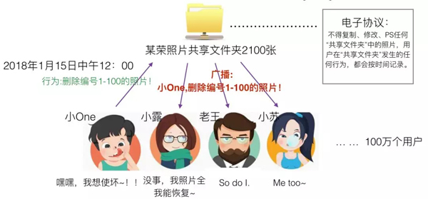 照片到底被删除了么?当然不是,因为小露手里也有照片嘛,她收到广播后可以立刻恢复共享文件夹中已经删除的照片,小 One 永远别想对“共享文件夹”搞修改破坏,且所有行为都同步记录在其他用户的电脑里。