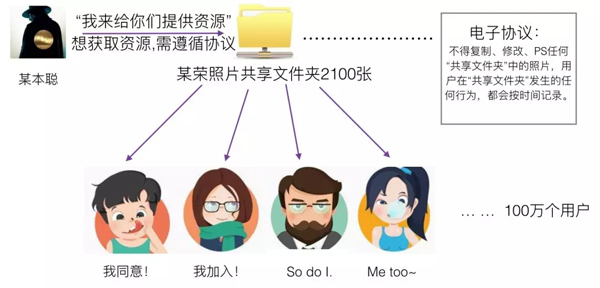 后来,一个叫“某本聪”的一个虚拟人物提供了,一个拥有协议的某荣照片共享文件夹,用户可以从中获取照片,但是必须遵循协议。