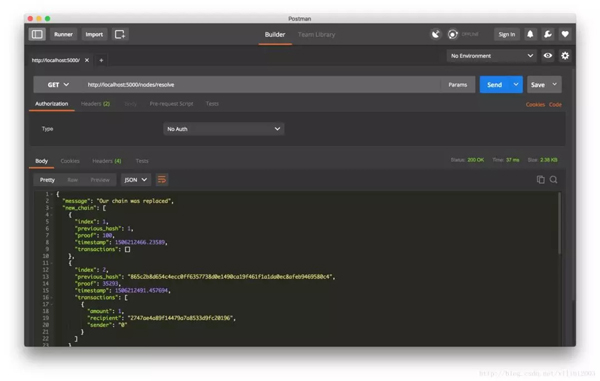 然后在节点 2 上挖两个块,确保是更长的链,然后在节点 1 上访问接口 /nodes/resolve,这时节点 1 的链会通过共识算法被节点 2 的链取代。