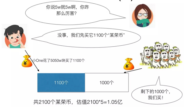 为了证实某荣币 5W 块一个,小 One 首先购买了 2100 个中的 1100 个,剩下的发行给吃瓜群众们啦,我们已经用 5W 买一个,说明他已经值这个价钱啦,剩下 1000 个大家一起买吧。