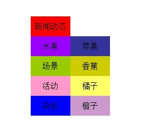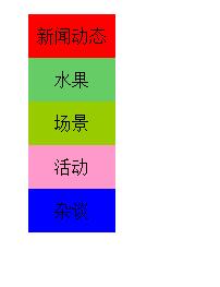 1 <!DOCTYPE html PUBLIC "-//W3C//DTD XHTML 1.0 Transitional//EN" "http://www.w3.org/TR/xhtml1/DTD/xhtml1-transitional.dtd"> 2 <html xmlns="http://www.w3.org/1999/xhtml"> 3 <head> 4 <meta http-equiv="Content-Type" content="text/html; charset=utf-8" /> 5 <title>无标题文档</title> 6 <style> 7 *{ 8 margin:0px; 9 padding:0px; 10 } 11 .aa{ 12 height:40px; 13 width:80px; 14 top:100px; 15 left:100px; 16 position:absolute; 17 overflow:hidden; 18 line-height:40px; 19 text-align:center; 20 background-color:#33C; 21 } 22 .aaa{ 23 height:40px; 24 width:80px; 25 top:100px; 26 left:100px; 27 position:absolute; 28 overflow:visible; 29 line-height:40px; 30 text-align:center; 31 background-color:#F00; 32 } 33 #bb{ 34 height:120px; 35 width:80px; 36 top:40px; 37 left:0px; 38 } 39 #table1{ 40 height:120px; 41 width:80px; 42 border:0px; 43 text-align:center; 44 vertical-align:middle; 45 } 46 #table2{ 47 height:160px; 48 width:80px; 49 border:0px; 50 text-align:center; 51 vertical-align:middle; 52 } 53 .cc{ 54 height:40px; 55 width:80px; 56 overflow:hidden; 57 line-height:40px; 58 text-align:center; 59 background-color:#6C6; 60 } 61 .ccc{ 62 height:40px; 63 width:80px; 64 overflow:visible; 65 line-height:40px; 66 text-align:center; 67 background-color:#90F; 68 } 69 #dd{ 70 top:-40px; 71 left:80px; 72 position:relative; 73 } 74 75 </style> 76 </head> 77 78 <body> 79 <div class="aa" onmouseover="this.className='aaa'" onmouseout="this.className='aa'">新闻动态 80 <div id="bb"><table cellpadding="0" cellspacing="0" id="table1"> 81 <tr> 82 <td><div class="cc" onmouseover="this.className='ccc'" onmouseout="this.className='cc'">水果 83 <div id="dd"> 84 <table cellpadding="0" cellspacing="0" id="table2"> 85 <tr><td bgcolor="#333399">苹果</td></tr> 86 <tr><td bgcolor="#CCCC00">香蕉</td></tr> 87 <tr><td bgcolor="#FFFF66">橘子</td></tr> 88 <tr><td bgcolor="#CC99CC">橙子</td></tr> 89 </table> 90 </div></div> 91 </td> 92 </tr> 93 94 <tr bgcolor="#99CC00"><td>场景</td></tr> 95 <tr bgcolor="#FF99CC"><td>活动</td></tr> 96 <tr bgcolor="#0000FF"><td>杂谈</td></tr></table> 97 </div></div> 98 99 </body> 100 </html>