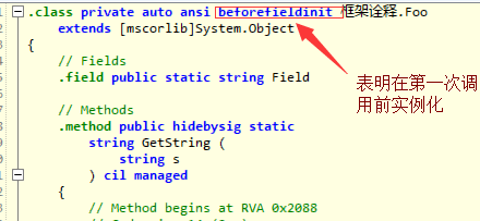 我们可以看到在这个类的声明上面多了一个beforefieldinit 关键字,表明在任何时候都可以执行构造器