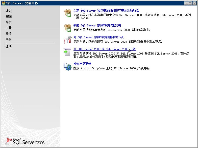 “入门(SQL Server 2008)”-->“初始安装(SQL Server 2008)”-->升级到SQL Server 2008 |