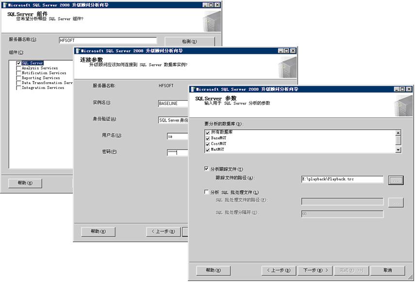 在图3.9的“SQL Server参数步骤”中,还可以一并提供SQL Server服务器端录制;或是 通过Profiler工具程序录制的跟踪文件(Trace file),以及日常执行的T-SQL批处理文件,借以分析这些SQL语法对数据库的访问在SQL Server 2008是否有兼容性问题。一切选择无误后就可以开始分析。