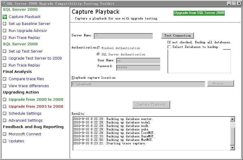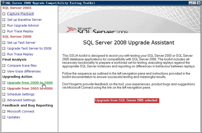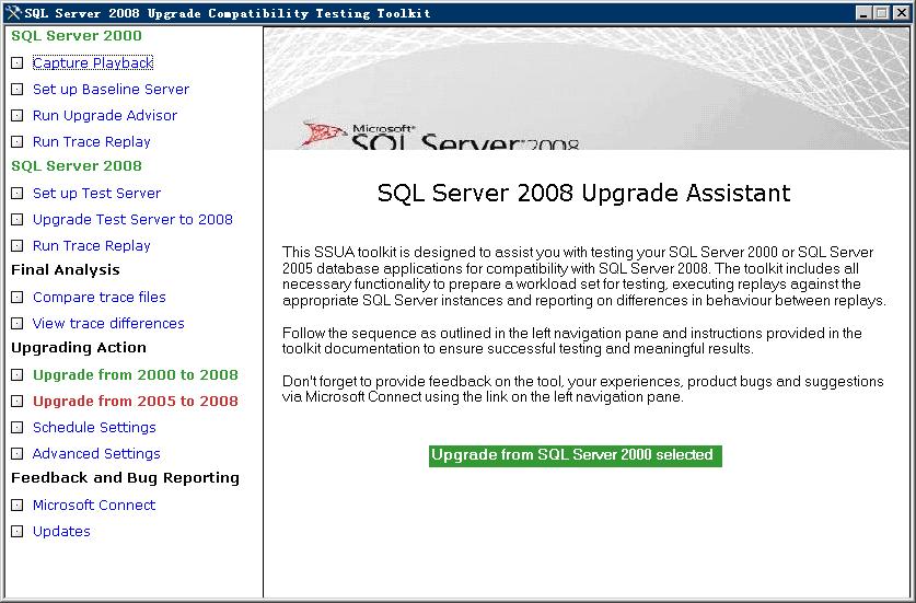 整个测试流程比较复杂,微软SQL Server团队因而与Scalability Expert公司合作开发出“SQL Server Upgrade Assistant 2008(以下简称SSUA)”工具程序,其中有各步骤的指引,对升级测试有很大的帮助。