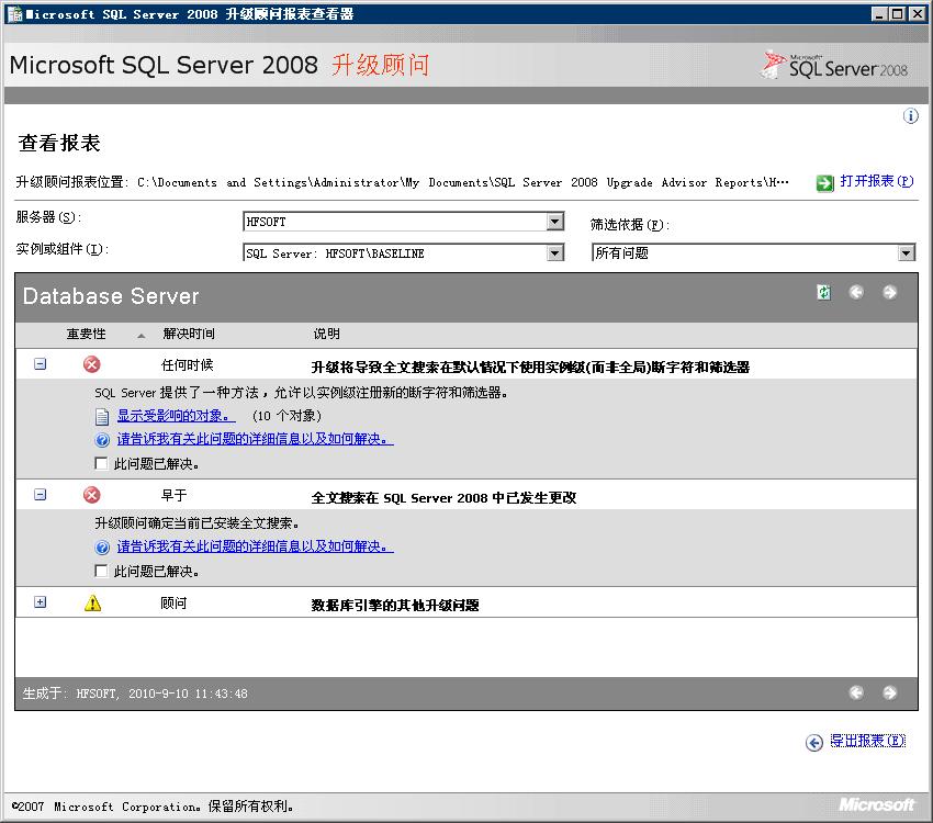 图3.10 升级顾问分析完毕后,会提出兼容性的报表