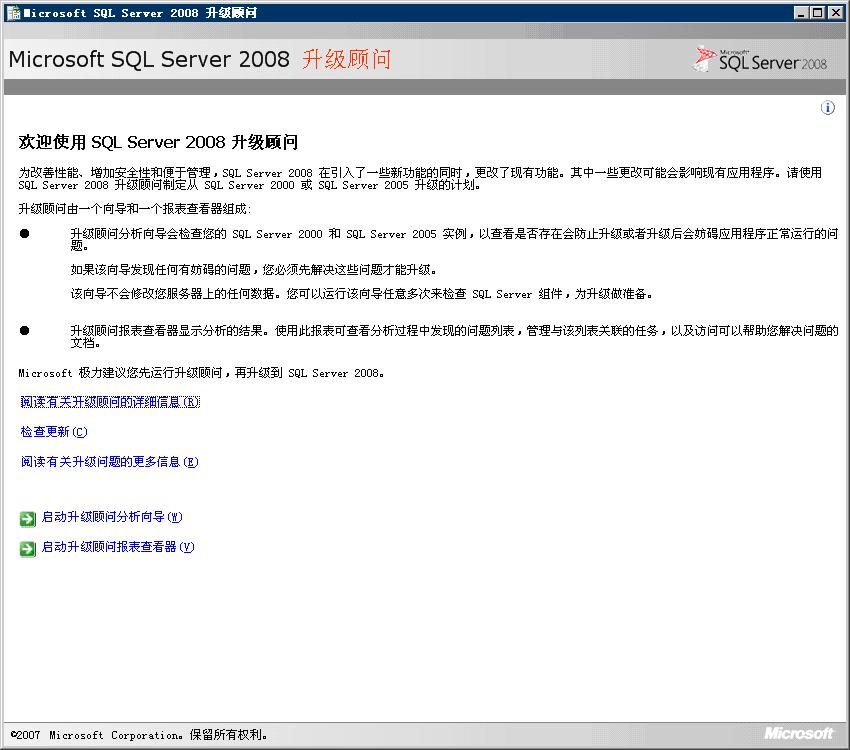 入门(SQL Server 2008)-->初始安装(SQL Server 2008)-->升级到SQL Server 2008-->使用升级顾问来准备升级 |