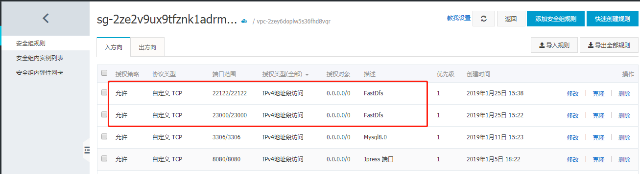 先后提示22122和23000端口无法连接,需要在阿里云的管理控制台添加安全组规则,配置如下: