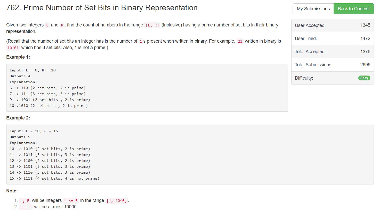 1 class Solution { 2 public int countPrimeSetBits(int L, int R) { 3 Set<Integer> prime = new HashSet<Integer>(Arrays.asList(2,3,5,7,11,13,17,19,23)); 4 int[] count = new int[1+R]; 5 int res = 0; 6 for(int i = 1; i <=R; i++) count[i] = count[i>>1] + (i&1); 7 for(int i = L; i <=R; i++) { 8 if(prime.contains(count[i])) res++; 9 } 10 return res; 11 } 12 }