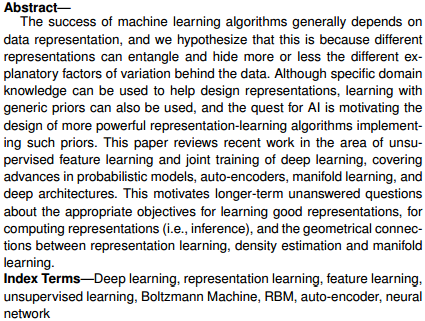 摘要:机器学习算法的成功普遍有赖于数据的表示方法,我们作此假设,是因为数据在不同的背景下会呈现出不同种解释,而不同的表示方法则可以或多或少地掩盖掉这种可变因素。尽管特定领域的特定知识可以用于表示方法的设计,但是,一般性的先验知识同样可以被拿来使用,且对人工智能的追寻,正激励着人们设计出可以将这些先验知识付诸实现的,更强大的——表示方法学习算法。本文回顾机器学习中无监督特征学习以及交叉训练的最新工作,内容包括概率模型、自动编码器、流形学习,以及深度学习架构的最新进展。这将激发一些长年未解的问题的发展,这些问题涉及:好的表示方法的学习、表示方法的计算(即推理)需要达到什么样的目标算为合适,表示方法学习、密度估计和流形学习三者之间具有什么样的几何关系。