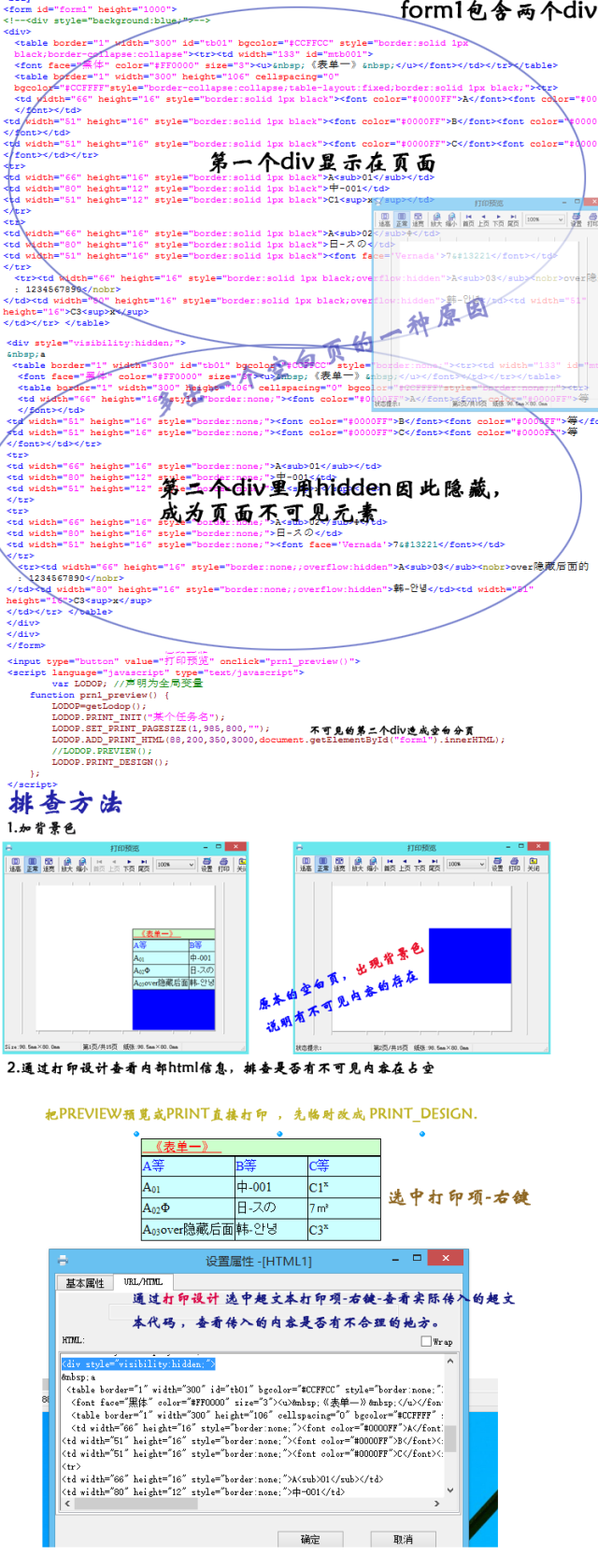 在用Lodop进行打印超文本的时候,本身内容看上去只有一页,却分页分出空白的一页,很有可能有不可见内容的存在,下面是测试的一种情况,如html内部有内容占着空间,却是不可见的,如一些对象,或者如测试内容中的一个div,div中设置了visibility属性为hidden,这种样式就变现为占着空间却不显示。