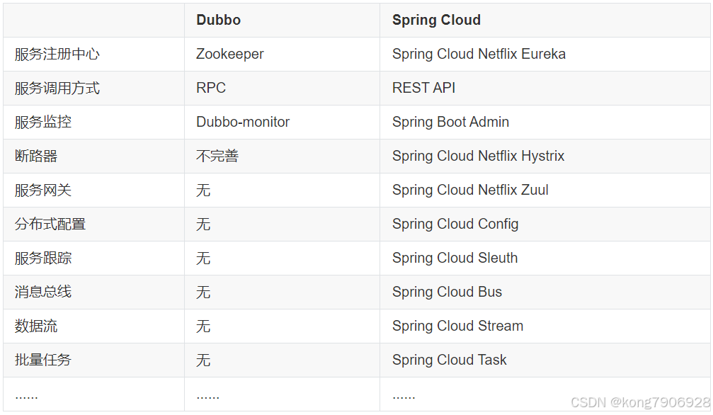 2:Dubbo和Spring Cloud并不是完全的竞争关系,两者所解决的问题域不一样:Dubbo的定位始终是一款RPC框架,而Spring Cloud的目的是微服务架构下的一站式解决方案。