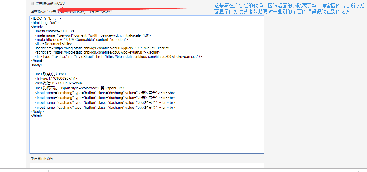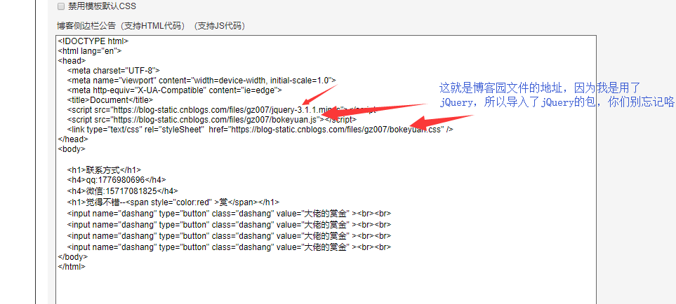 <!DOCTYPE html> <html lang="en"> <head> <meta charset="UTF-8"> <meta name="viewport" content="width=device-width, initial-scale=1.0"> <meta http-equiv="X-UA-Compatible" content="ie=edge"> <title>Document</title> <script src="https://blog-static.cnblogs.com/files/gz007/jquery-3.1.1.min.js"></script> <script src="bokeyuan.js"></script> <link type="text/css" rel="styleSheet" href="bokeyuan.css" /> </head> <body> <h1>联系方式</h1> <h4>qq:1776980696</h4> <h4>微信:15717081825</h4> <h1>觉得不错--<span style="color:red" >赏</span></h1> <input name="dashang" type="button" class="dashang" value="大佬的赏金" ><br><br> <input name="dashang" type="button" class="dashang" value="大佬的赏金" ><br><br> <input name="dashang" type="button" class="dashang" value="大佬的赏金" ><br><br> <input name="dashang" type="button" class="dashang" value="大佬的赏金" ><br><br> </body> </html>
