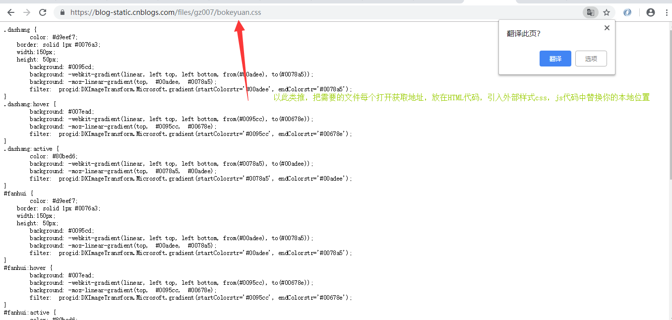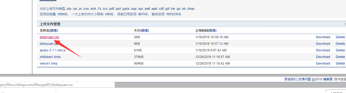 这里点击你上传的文件就可以得到该文件在公网上的地址如我的:https://blog-static.cnblogs.com/files/gz007/bokeyuan.css