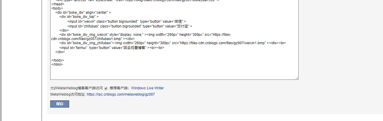 <!DOCTYPE html> <html lang="en"> <head> <meta charset="UTF-8"> <meta name="viewport" content="width=device-width, initial-scale=1.0"> <meta http-equiv="X-UA-Compatible" content="ie=edge"> <title>Document</title> <script src="https://blog-static.cnblogs.com/files/gz007/jquery-3.1.1.min.js"></script> <script src="bokeyuan.js"></script> <link type="text/css" rel="styleSheet" href="bokeyuan.css" /> </head> <body> <div id="boke_div" align="center" > <div id="boke_div_top" > <input id="weixin" class="button bigrounded" type="button" value="微信" > <input id="zhifubao" class="button bigrounded" type="button" value="支付宝" > </div> <div id="boke_div_img_weixin" style="display: none;" ><img width="260px" height="300px" src="https://files-cdn.cnblogs.com/files/gz007/zhifubao1.bmp" ></div> <div id="boke_div_img_zhifubao"><img width="260px" height="300px" src="https://files-cdn.cnblogs.com/files/gz007/weixin1.bmp" ></div><br> <input id="fanhui" type="button" value="回去观看博客" ><br><br> </div> </body> </html>