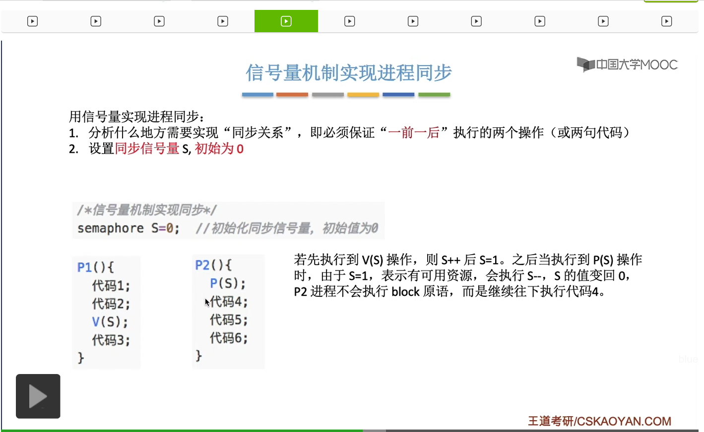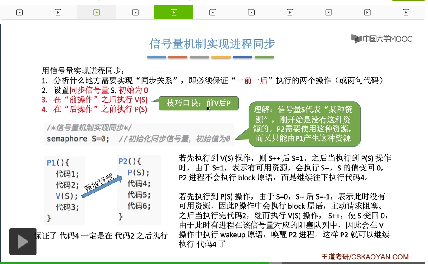 我们依然是用信号量代表某种资源这样的思路来分析这个问题。这个信号量S它表示某种资源,那具体是什么资源没必要关心。刚开始S的值是0,就意味着刚开始这种资源是没有的,而P2要执行代码4之前,它一定需要获得这个资源,所以它在执行代码四之前,需要执行一个P操作。但是呢这种资源只有P1能够释放,所以当P2申请这种资源得不到满足的时候,它就会被阻塞。而由于这种资源只有P1能够产生,所以只有P1能够在某一个特定的位置唤醒P2这个进程,所以这就实现了进程之间的同步关系。我们设置一个信号量初始值为0,表示刚开始这种资源是没有的,而只有执行前面那个操作的进程,可以释放这种资源,所以这是前V。而执行后面那个操作的进程,在它的操作之前,需要申请一个这个资源,所以这是后P。当它申请的这个资源得不到满足的时候,这个进程就会阻塞,只能由前面那个进程把它唤醒。那这个技巧是解决进程同步问题的一个关键。