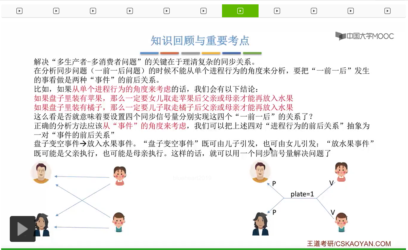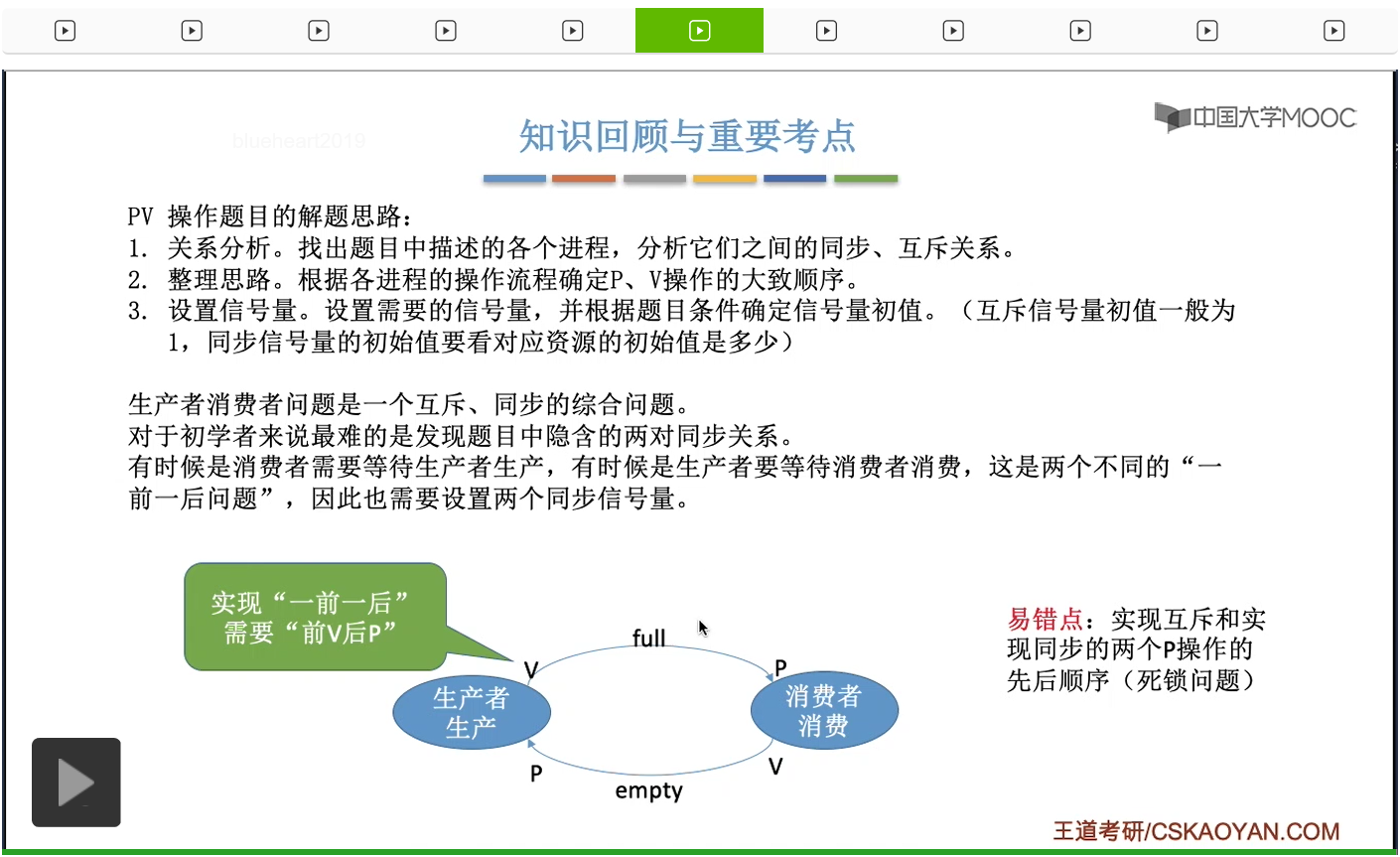 好的那么这个小节当中我们介绍了一个很经典的进程的同步互斥问题,就是生产者-消费者模型。对于初学者来说最难的是发现题目中隐含的两对同步关系,有时候是生产者进程在等待消费者进程,有的时候又是消费者进程需要等待生产者进程,所以这是这个题目当中的难点,它是两对不同的、一前一后的这种关系,所以我们相应的也需要给它们设置两对不同的信号量,但是对这些信号量的操作肯定都是遵循一个前V后P的这个原则。另外还需要再强调一遍的是,实现互斥和实现同步是两个不同的P操作,而实现互斥的那个P操作,一定要在实现同步的P操作之后,否则会导致死锁的问题。我们不会再像之前一样,每一个同步信号量都来分析它背后的含义,这个需要大家自己去练习和体会。