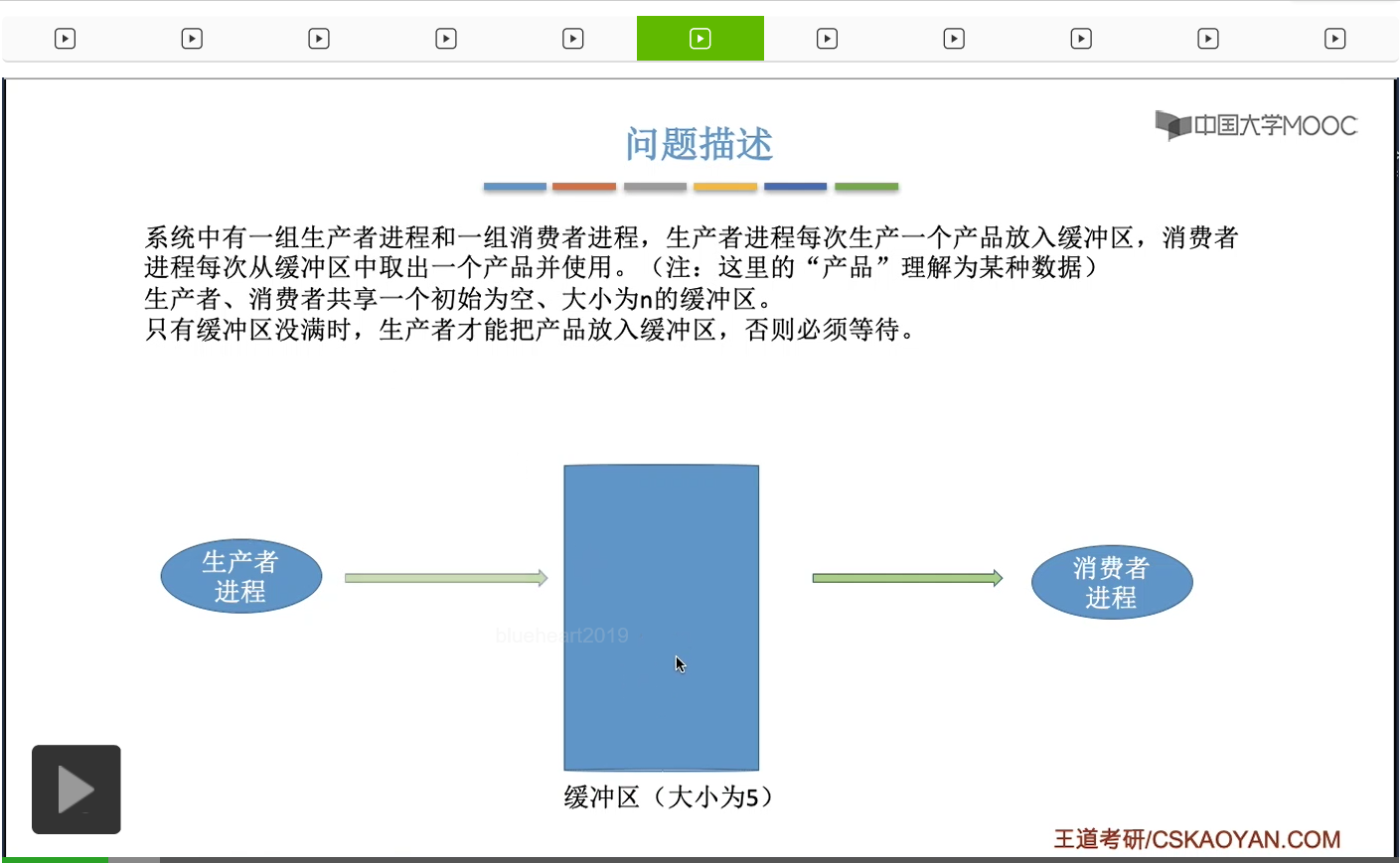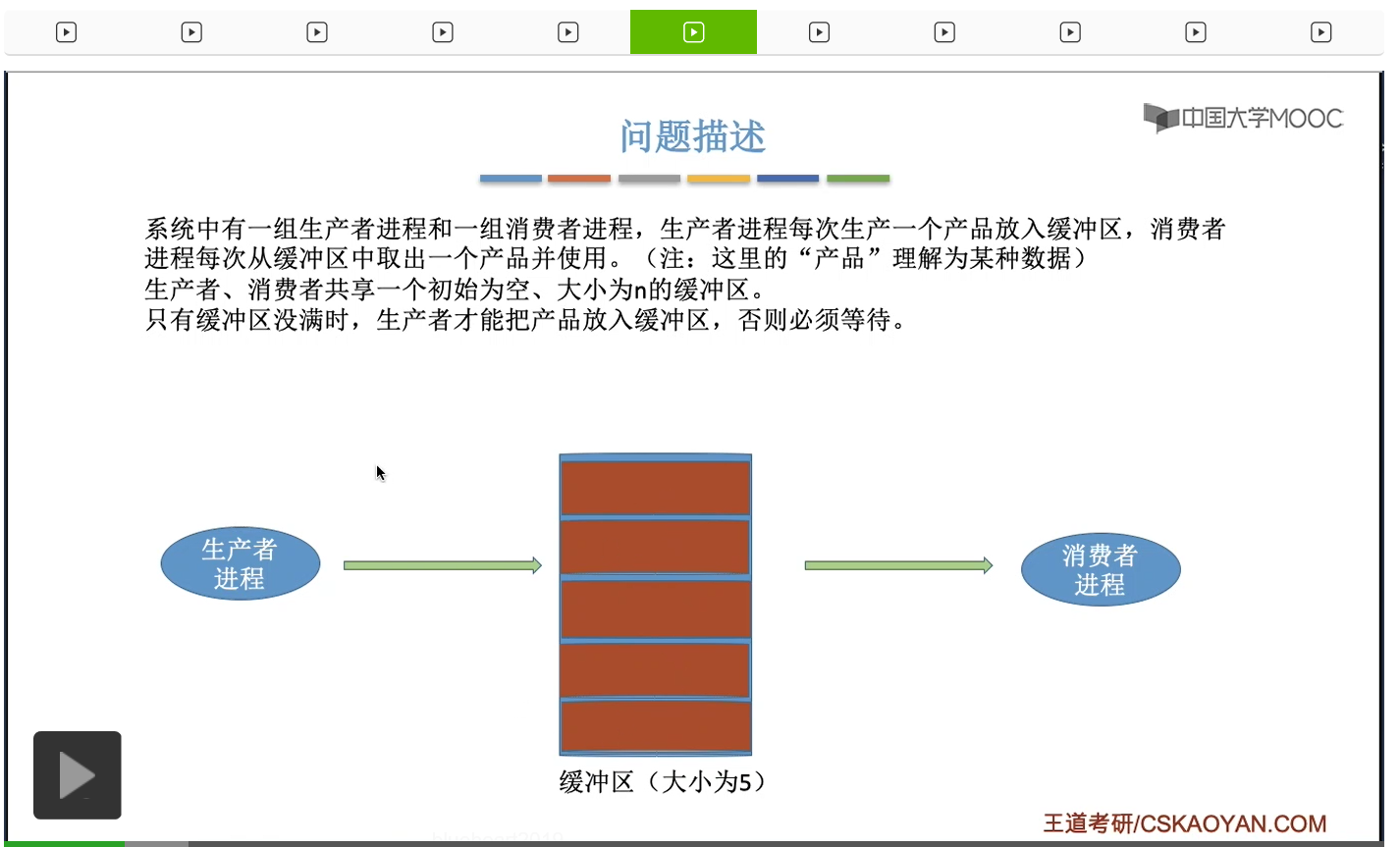 一个经典的进程同步互斥的问题,并且尝试用上个小节学习的PV操作也就是信号量机制来解决这个生产者消费者问题。缓冲区其实就是用来存放数据的一片区域,我们可以把它理解为一个一个的小格子。每一个缓冲区也就是每一个小格子里面可以放一个产品,也就是一坨数据。然后消费者呢又会从这些缓冲区当中每次取出一个产品,也就是每次取出一坨数据。那生产者和消费者这两组进程它们会共享地使用一个初始为空、大小为n的缓冲区,也就是有n个小格子可以放n坨产品。那需要注意的是,这个缓冲区是有容量限制的,它只能放五个产品。那只有缓冲区没有满的时候,生产者才可以往这个缓冲区里放入产品。